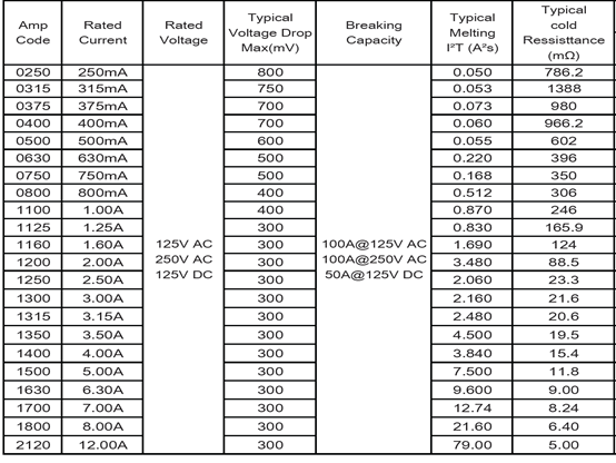 Normal amperes: 250mA 315mA 375mA 0.4A 0.5A 0.63A 0.75A 0.8A 1A 1.25A 1.6A 2A